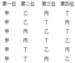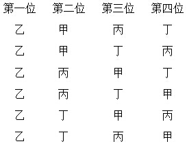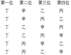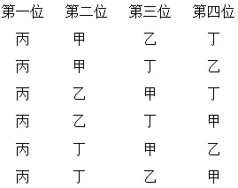 然后让丙在第一位固定不变,让甲、乙、丁分别在第二位,也是6种分工方式。如图: