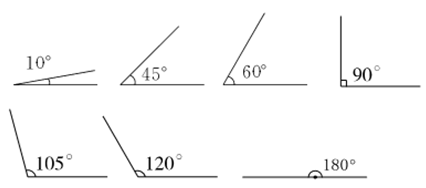 10°、45°和60°的角是锐角;90°的角是直角;105°和120°的角是钝角;180°的角是平角。