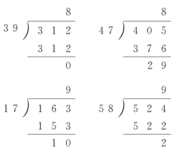 发现:被除数和除数最高位上的数相同,并且被除数的前两位比除数小。这些题的商是8或9。