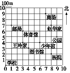 8.(1)医院所在的位置可以用(8,2)表示,它在学校以东800m,再往北200m处。少年宫所在的位置可以用(6,4)表示,它在学校以东600m,再往北400m处。公园所在的位置可以用(9,5)表示,它在学校以东900m,再往北500m处。体育馆所在的位置可以用(3,6)表示,它在学校以东300m,再往北600m处。邮局所在的位置可以用(1,7)表示,它在学校以东100m,再往北700m处。商场所在的位置可以用(7,9)表示,它在学校以东700m,再往北900m处。