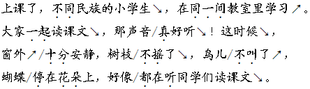 解析 这是一篇抒情散文。抒发了作者对民族小学的自豪和赞美之情。朗读本文时,要用自豪、赞美的语气,声音清脆欢快。如朗读描写鲜艳的民族服装的部分时,要用自豪的语气,重读“鲜艳”“更加”等词;描写同学们上课读书的情景的部分时,要读出自豪、赞美之情,“真”要重读;朗读描写同学们下课玩耍的场景的部分时,要用轻松、活泼的语气。