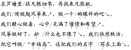 解析 本篇文章语言朴实,情真意切,温馨自然。朗读时,要表现出做风筝、放风筝的快乐,同时也要表现出找风筝时着急和伤心的心情。语调由明快舒缓向低沉稍快转变。