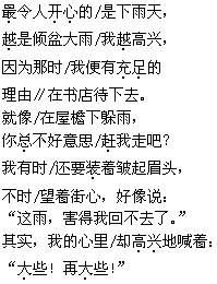 答案 “急忙打开书,一页,两页,我像一匹饿狼, 贪婪地读着。”“最令人开心的是下雨天,越是倾盆大雨我越高兴,因为那时我便有充足的理由在书店待下去。”“我合上书,咽了一口唾沫,好像把所有的智慧都吞下去了,然后才依依不舍地把书放回书架。”