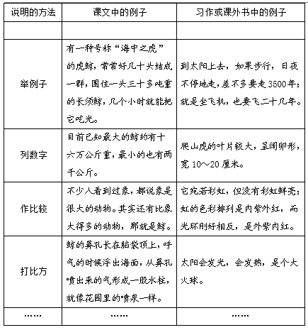 解析 首先,同学们回顾自己课内外阅读的说明文,想一想每篇文章分别介绍了哪些事物及其有关知识,再读读文中都运用了哪些说明方法,然后再填写下面的表格。例如,课内我们学习的《鲸》这篇课文,向我们介绍了鲸的形体特点、进化过程、种类和生活习性等方面的知识,运用了列数字、举例子、作比较、打比方等多种说明方法。课外阅读《谁的眼睛最好》分别介绍了猫头鹰、海龟、昆虫、豹、牛的眼睛的构造及作用,从而说明了每种动物的眼睛对于它本身而言都是最好的,都能很好地适应生存。“鹰眼视野宽阔,视力敏锐,翱翔于两三千米高空也能发现地面上的小动物。人要是处于那样的高度,能看到的范围就要窄得多。”这两句话运用列数字和作比较的方法说明鹰眼的视野宽阔,视力敏锐。
