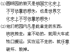 (2)这句话出现在英法联军侵入北京,闯进圆明园之后。“凡是”“统统”说明他们已经把圆明园洗劫一空。“任意”则写出了他们的疯狂、野蛮。这句话生动地表现了英法联军的贪婪,激起了读者的强烈愤慨,增强了振兴中华的责任感和使命感。