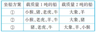 (2)因为1吨=1000千克,小牛的质量是600千克,所以另一只小动物的质量小于或等于1000-600=400(千克),都可以和小牛同时过桥。观察情境图发现,小熊和小狮子的质量都小于400千克,可以分别和小牛同时过桥。
