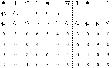 30405060809 三百零四亿零五百零六万零八百零九…………(8分)
