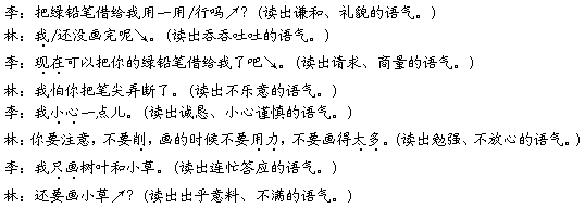 解析 从课文整体来看,李丽从头到尾都很有礼貌,林园园则表现得比较自私,不肯借绿铅笔又不明说,找了一个又一个借口推托。朗读时,同学们要用恰当的语气表现出人物的性格特点。