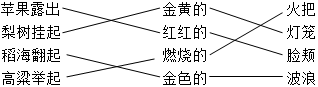【解析】做题时,先回忆课文内容,再根据景物特点进行连线。梨是金黄的,像灯笼;苹果是红红的,像脸颊;稻海是金色的,像波浪;高粱像燃烧的火把。连好后,按顺序读一读,看看跟课文内容是否一样。