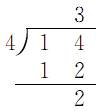 14表示一共有14个棒棒糖,4表示平均分给4个小朋友,3表示每个小朋友分得3个棒棒糖,12表示分掉的12个棒棒糖,2表示还剩2个棒棒糖。