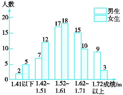 (2)(答案不唯一)男生、女生立定跳远成绩在1.52~1.61 m之间的居多……