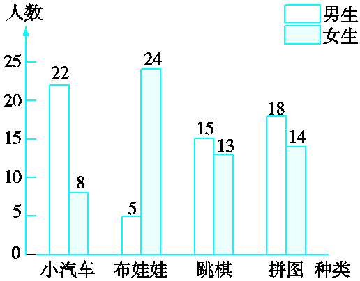 (1)男生喜欢小汽车的人数最多,女生喜欢布娃娃的人数最多。