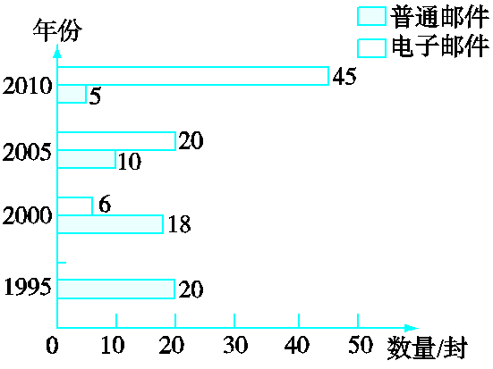 (1)1995年收到的普通邮件最多,2010年收到的电子邮件最多,普通邮件呈逐年下降的趋势,电子邮件呈逐年上升的趋势。