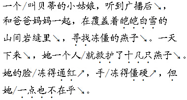 解析 朗读第1自然段时,语调上扬,体现出新奇、疑惑之情,其中“站满”“特殊”“专列”要加重语气;朗读第2自然段时,语气是凝重的、急迫的,体现出严峻的天气形势;朗读第3、4自然段时,要用焦急的语气,第3自然段中“纷纷”“冒着”“顶着”“踏着”“四处”要加重语气,第4自然段中“通红”“僵硬”“但”“一点也不”应加重语气;朗读最后一个自然段,语气是欣慰深情的。