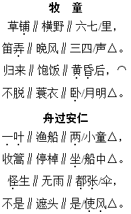 解析 本课所选的三首古诗词,描写的都是古代儿童有趣的生活,表达了孩子无忧无虑、天真烂漫的天性。朗读时,要感受到清新的乡土气息,浓郁的生活情趣,语调活泼、亲切、自然。《牧童》向我们展示了一幅鲜活的牧童晚归休憩图,读时语调舒缓、轻快。《舟过安仁》展示了无忧无虑的两个小渔童充满童稚的行为和行为中透出的只有孩童才有的奇思妙想,读时要用充满童真和童趣的语气,有疑问,有恍然大悟之感,语调舒缓、张扬。《清平乐·村居》描绘出一家五口各具情态的形象,表现人情之美和生活之趣,读时要用亲切的语气,语调轻快、活泼。
