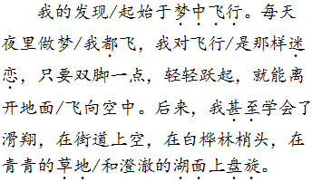 解析 本文记叙了童年的发现,反映了儿童求知若渴的特点和惊人的想象力。朗读时,要深入体会作者的探究精神及情感变化。关于描述梦的一段,要通过“只要……就……”“甚至”“那样”“似乎”等词语,读出梦的神奇和梦中飞行的美妙;关于请教老师的部分,要读出好奇的心理和迫切探究的心情;课文的结束句一语双关,要读出自嘲和愤慨的语气。