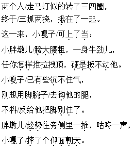 “起初,小嘎子精神抖擞,欺负对手傻大黑粗,动转不灵,围着他猴儿似的蹦来蹦去,总想使巧招,下冷绊子,仿佛很占了上风。”这句话写出了小嘎子机敏、富有心计的特点。
