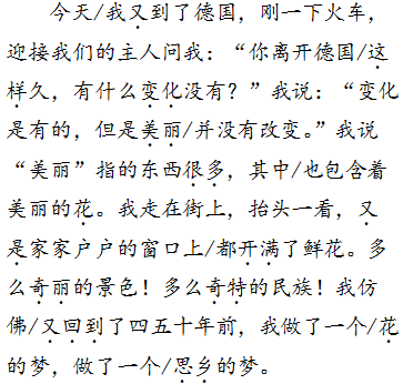 解析 本文表达了作者对德国奇丽的风景和与众不同的风俗习惯的赞美之情。朗读基调是深情的赞美。语调平缓之中有起伏,语气平淡之中有激昂。朗读第一自然段时,要适当突出“花”“德国”各自“在其中占重要的地位”;而第二自然段要读出作者对德国人爱花之真切感到吃惊的语气;第三自然段要读想结合,读出作者对这奇丽风景的欣赏和赞美之情;第四自然段要读出作者由衷的赞叹之情。