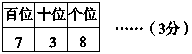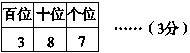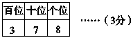分析:本题考查了学生对数位及数位上数的意义的认识和理解。用3、7、8这三个数字组成不同的三位数。因为每个数字只能用一次,所以要想使“3”表示3个一,则“3”应该在个位上,“7”和“8”则分别应在百位或十位上,组成的三位数应是783或873。要想使“3”表示3个十,则“3”应该在十位上,“7”和“8”则分别应在百位或个位上,组成的三位数是738或837。要想使“3”表示3个百,则“3”应该在百位上,“7”和“8”则分别应在十位或个位上,组成的三位数是378或387。