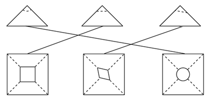 方法一:这道题可以按题目中所给图示进行操作。按第(1)组图示对正方形纸进行折叠,按第(2)组图示画线,裁剪。展开后与第(3)组图形去一一对应,看与哪个展开图是相对应的关系。